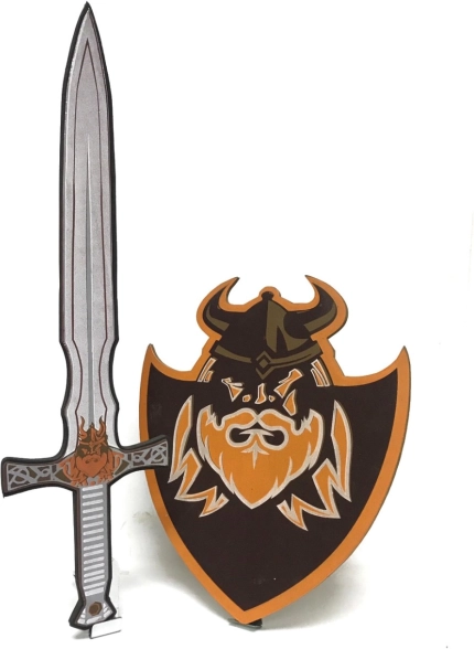Sjovt og sikkert sæt til små krigere: skumsværd og skjold med Viking-motiv. Takket være det bløde materiale er legen sikker, let og ideel som tilbehør til fastelavnskostume eller til hjemlige eventyr.