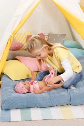 BABY born-pige med magisk sut er den ideelle ledsager til daglig leg og øvelse i babypleje. Ved at dreje sutten åbner eller lukker hun øjnene, også når hun sidder – uanset kropsposition. Når hun lægges på ryggen uden sut, lukker øjnene automatisk. Den bløde Soft Touch-krop og de let bevægelige arme, ben og hoved gør påklædning nem og øger autenticiteten.
