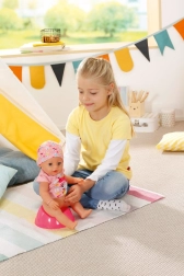 Takket være de realistiske funktioner drikker dukken vand fra flasken, spiser grød, tisser i bleen eller potten, græder ægte tårer og kan også lave stort. Leg med dukken understøtter naturligt sociale færdigheder – empati, kommunikation og ansvarlighed. I æsken finder du 10 praktiske tilbehør, der udvider legemulighederne – helt uden brug af batterier.