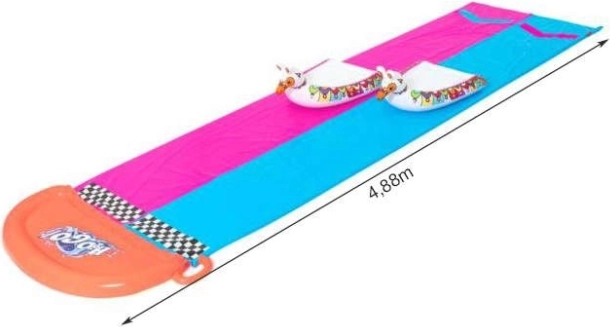 Nyd sommeren fuldt ud med den dobbelte vandrutsjebane H2O GO! fra Bestway. To parallelle baner på 4,88 m, tilslutning til havevandslangen og forfriskende sprays langs hele banen sikrer et hurtigt og glat glidefod. I pakken er der 2 oppustelige lamaer til kapløb, nem installation på græsplænen og en sikker sprøjtende slutzone for en blød afsluttende plasketur.