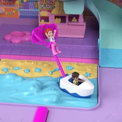 Tag på tur med POLLY POCKET og hendes bærbare resort, der både er en rullekuffert og et udklappeligt legesæt. Når det åbnes, forvandles det til et tretagers hotel med elevator, strand og promenade og masser af interaktive elementer. I sættet får du 4 minidukker, en cabriolet og 25+ tilbehørsdele. Takket være den udtrækkelige håndtag og hjul kan der leges hvor som helst – hjemme og på farten.