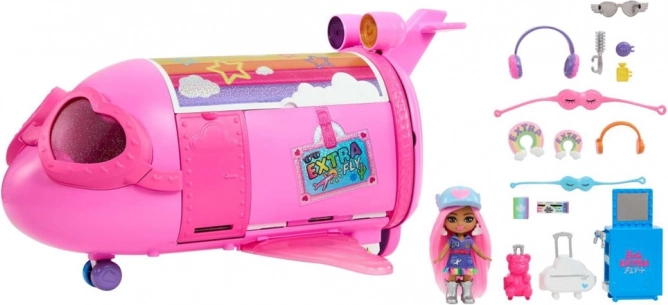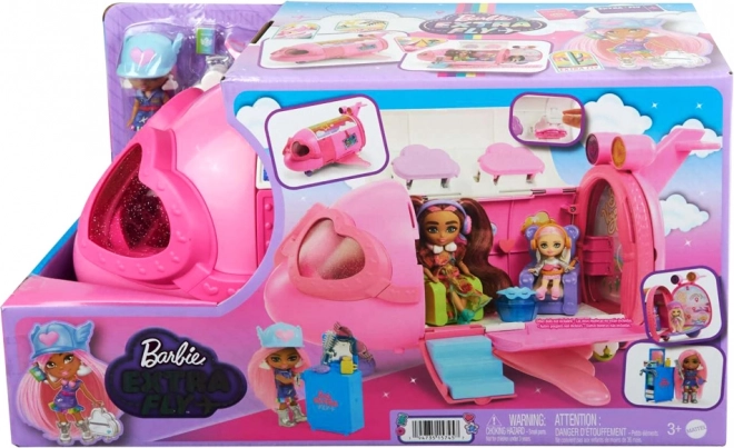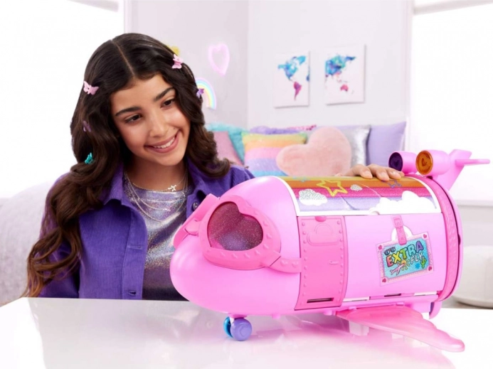 Det lyserøde fly BARBIE Extra Fly Minis bringer børn ind i en fantasiverden fuld af farver og stil. Åbentag, nedklappelige trin og en bagklap, der bliver til en regnbue-“runway”, forvandler hver flyvning til et modeshow. Mini-dukken – piloten med lyserødt hår, kasket med hjerte og skyformede øreringe – giver legen et unikt præg.