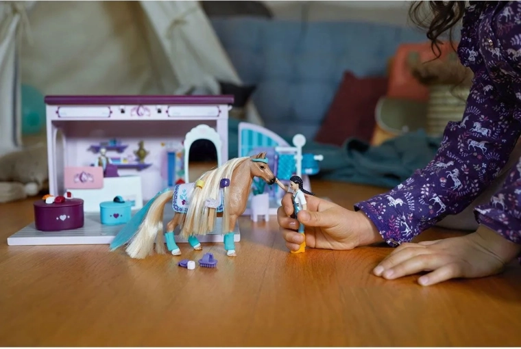 Sammenklappelig ridesalon fra Schleich HORSE CLUB Sofia's Beauties-kollektionen tilbyder alt, hvad du behøver for perfekt stil til din hest. Gør det let at skifte man og hale for de bedste fotosessioner.