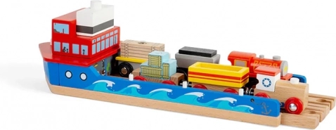 Et tilbehør, der bringer liv til enhver træ-togbane. Det blå fartøj med rød styrehus, malede bølger og naturligt trædæk passer perfekt til både kyst- og piratsæt. Takket være den nedfældelige rampe kan togene let køre ombord og af igen, hvilket understøtter fantasi, finmotorik og koordination.