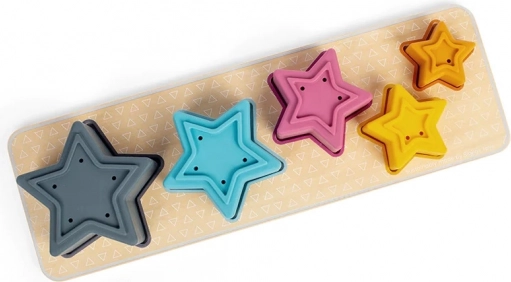 Opdag det sjove indsætningspuslespil med stjerner lavet af en kombination af FSC-træ og silikone, som udvikler børns finmotorik, farve- og størrelsesgenkendelse, og som desuden kan bruges i badet takket være springvandseffekten fra stjernerne med huller.