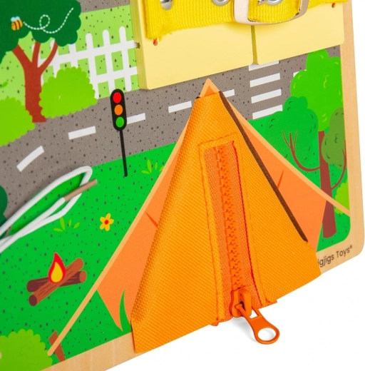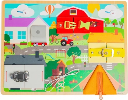 Opdag et sjovt og lærende legetøj til børn fra 3 år – en motorikplade med forskellige låse, spænder og lynlåse, der udvikler finmotorik, hånd-øje-koordination og praktiske færdigheder. Hver åbning afslører en skjult scene og stimulerer kreativitet og nysgerrighed. Fremstillet af FSC-certificeret træ med omtanke for naturen.