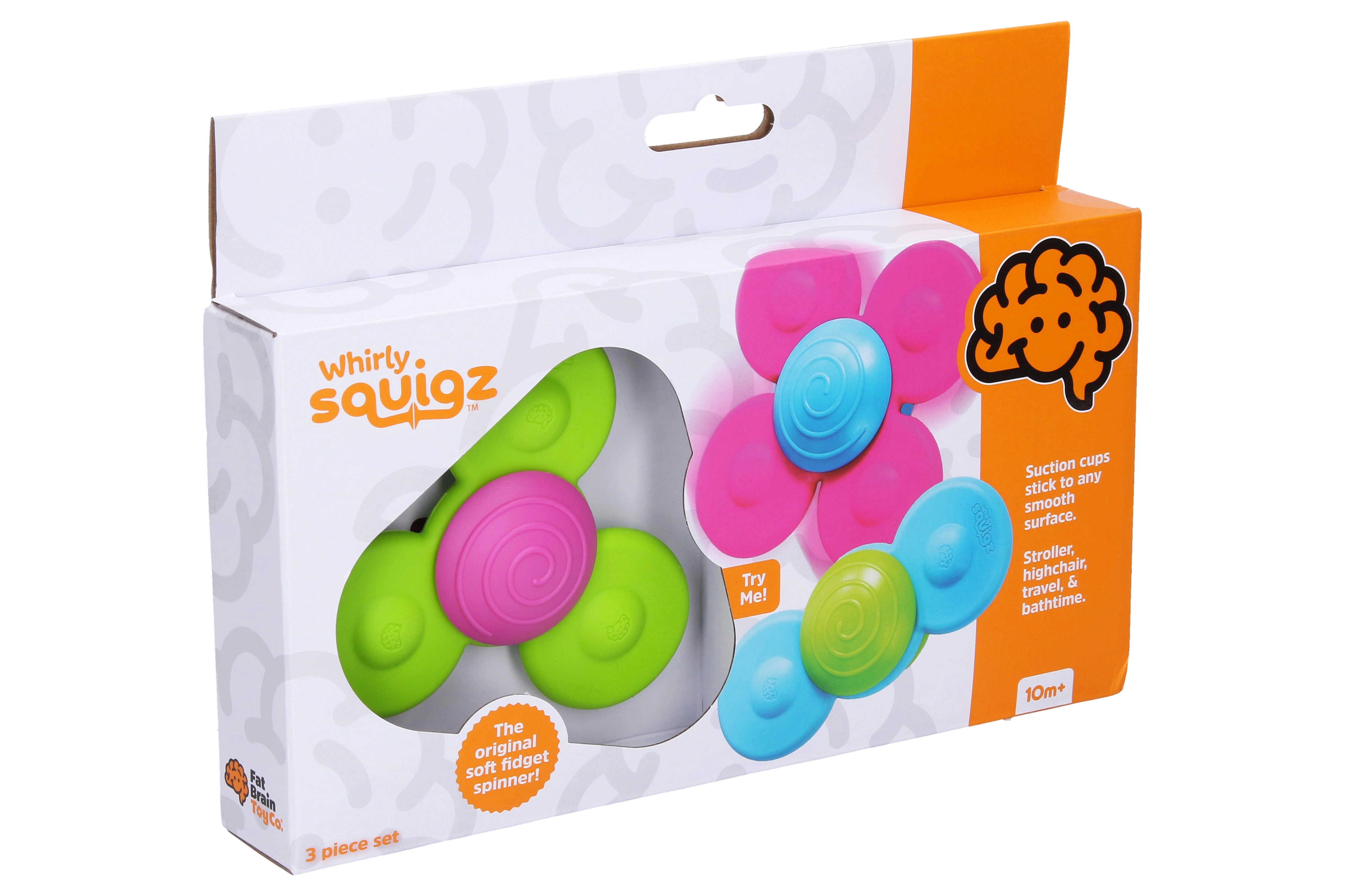Opdag sjove sanse- og motoriklegetøj til de mindste – et sæt med tre farverige WHIRLY SQUIGZ-spinnere med sugekopper. De fæstner nemt på glatte overflader og roterer jævnt ved berøring. De støtter finmotorik, koncentration og sanseopfattelse. Ideelle til vinduer, badekar, fliser eller højstol. Blødt materiale, sikre former og endeløs snurren til børns glæde.