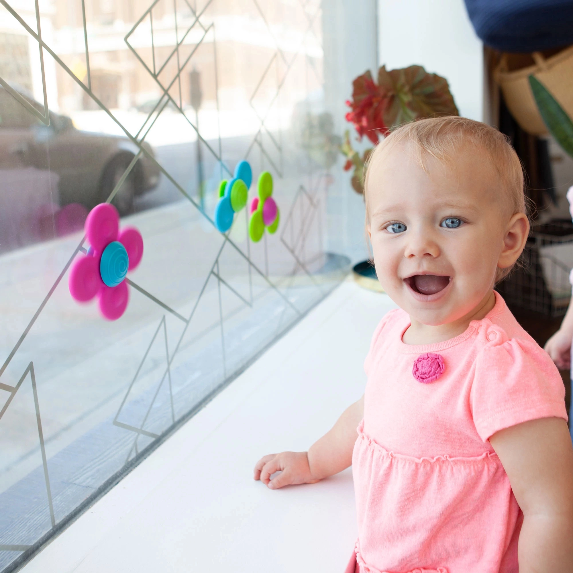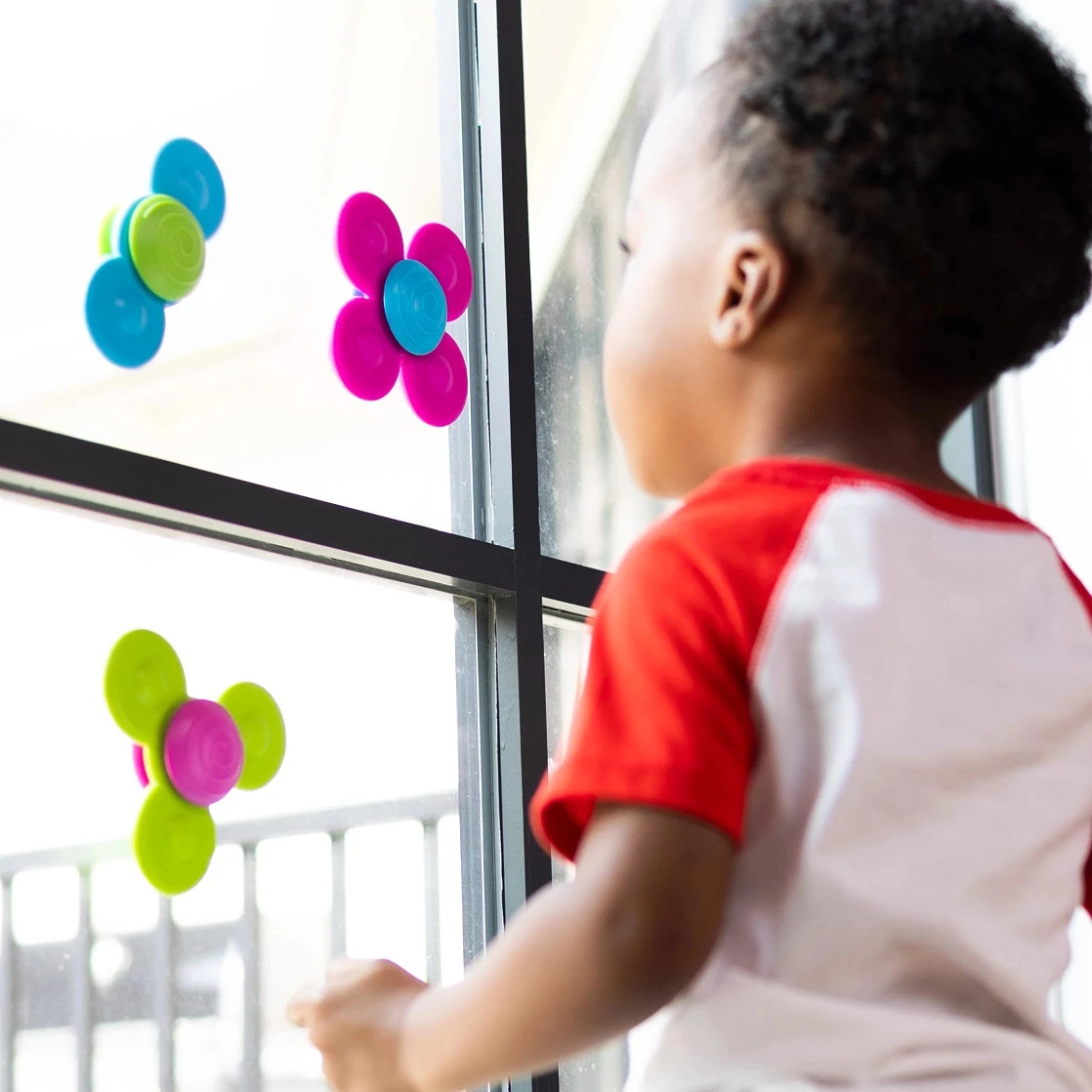 Spinnerne fæstnes nemt på vinduer, fliser, badekar eller højstol, så børn kan lege hvor som helst – både hjemme og på farten.