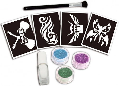 Sættet er perfekt til fødselsdage, børnefest og kreativ hygge derhjemme. Følg den medfølgende vejledning, og tryl på et øjeblik glitrende motiver frem på huden, der tiltrækker opmærksomhed.