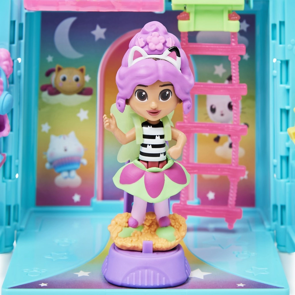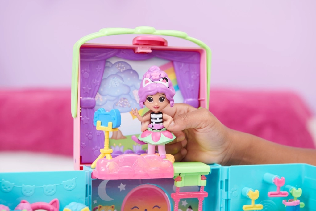 Sættet støtter kreativitet og fantasi hos børn fra 3 år og er kompatibelt med huset Gabby’s Purrfect Dollhouse for endnu mere leg. Den kompakte “katte”-kuffert fungerer som både opbevaringsorganisator og bærbar scene til leg hvor som helst.