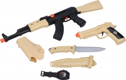 Dette legetøjssæt til små eventyrere giver alt, hvad der skal til for spændende missioner: en stor maskinpistol, en kompakt pistol med hylster, en kniv med hylster og et ekstra armbåndsur. Takket være mekaniske akustiske effekter uden batterier får børnene en autentisk aftrækslyd uden bekymringer om batteriskift.