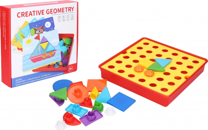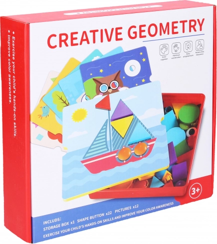 Kreativ mosaik med geometriske former for børn, som understøtter finmotorik, logisk tænkning og kreativitet. Pakken indeholder en base 25 × 25 cm, 22 former og 12 skabeloner til nem sammensætning af billeder.