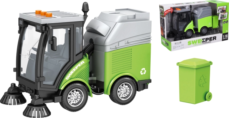 Små chauffører vil elske den detaljerede rensebil med skraldespand, som giver en realistisk oplevelse af bytrafik. Med friktionsmotor er det nok at skubbe bilen, så suser den selv fremad. Knapperne på kabinen udløser effekter, der troværdigt efterligner et rigtigt køretøj: motorstart, horn og bakkelyd ledsaget af lys.
