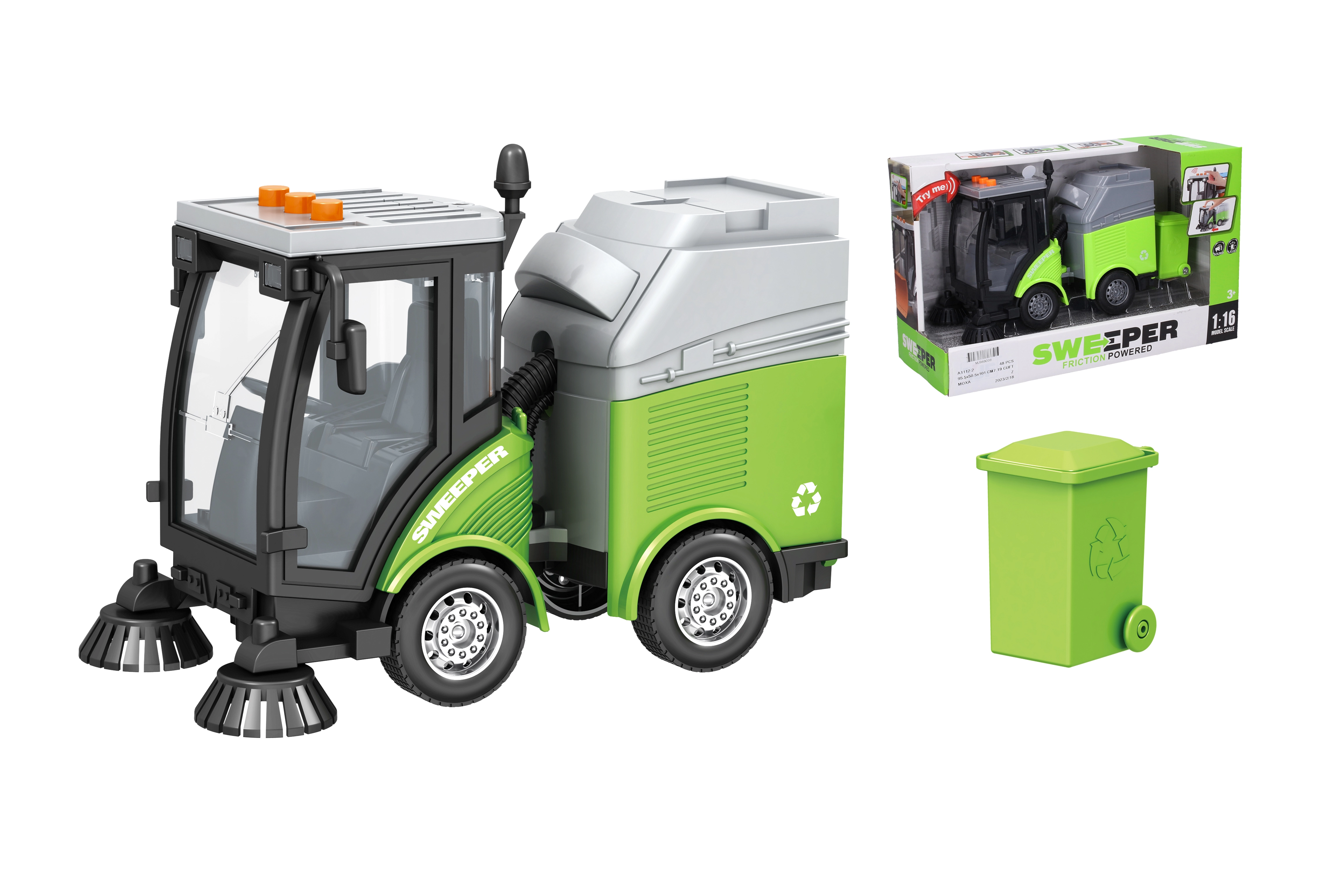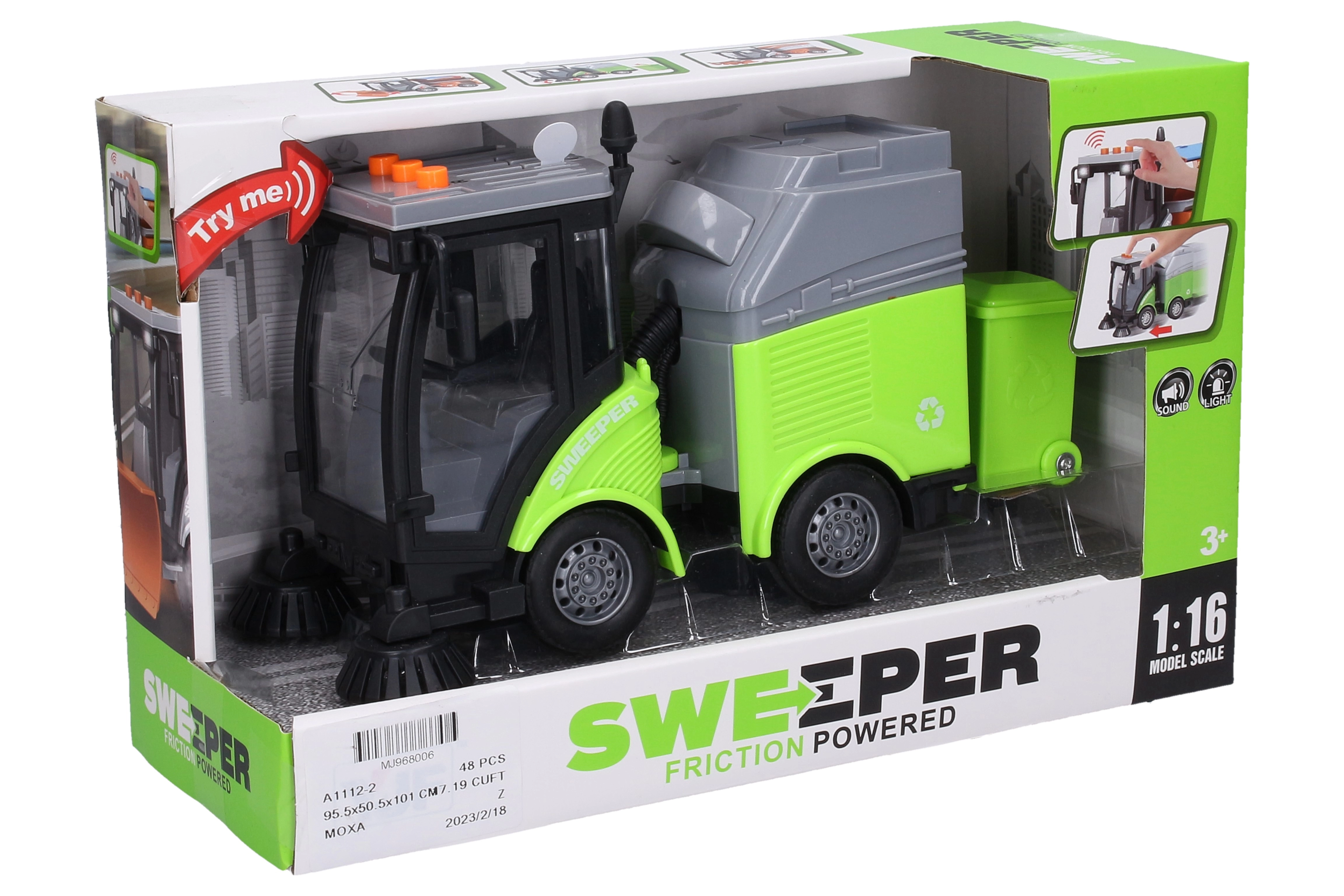Sjov og realistisk rensebil med skraldespand på 24 cm til alle små teknikentusiaster. Takket være friktionsmotor kører bilen jævnt og let, og stemningen skabes af lys- og lydeffekter, der aktiveres med knapper på kabinen – start, horn og bakning. Batterier 3× AG13 medfølger i pakken, så legen kan begynde med det samme.