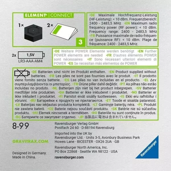 - Kompatibilitet – fungerer med øvrige elementer i GraviTrax-serien; kræver yderligere Power-elementer for brug.