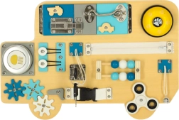 Den sensoriske plade i busform vil begejstre alle små transportentusiaster. Trædetaljer med biltema, skjulte billeder af vaskehal og tankstation samt bevægelige elementer understøtter nysgerrighed og lærer børn om årsag og virkning.