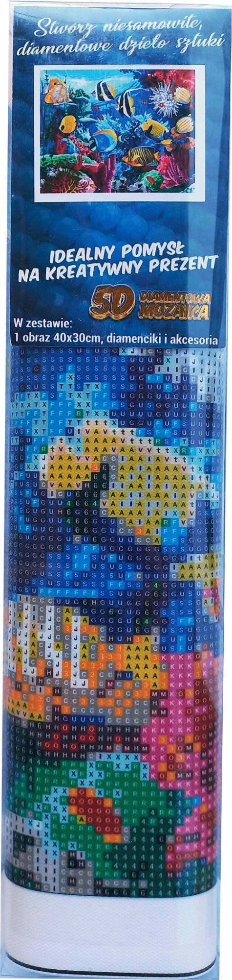 Diamantmaling – fremgangsmåde: Den øverste side af lærredet er belagt med lim og dækket af en gennemsigtig folie. Fjern folien gradvist i sektioner efterhånden som du påfører stenene. Hvis hele folien fjernes på én gang, kan klæbelaget blive beskidt, og stenene hæfter muligvis ikke så godt. Lærredet indeholder symboler, som er angivet i den vedlagte legend og henviser til den tilsvarende pose med sten markeret med et nummer. Hæld stenene fra den pågældende pose i bakken. Optag voks i pennens spids, så stenene let hæfter på pennen. Påfør stenene på motivet med pennen. Når en farve er færdig, hælder du stenene tilbage i posen og fortsætter med den næste farve.