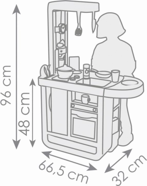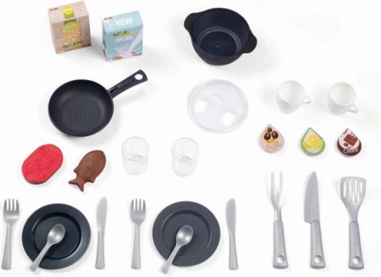 Dette køkkensæt indeholder en vask med vandhane, køleskab og espressomaskine med kapsler til te og kaffe. Derudover medfølger realistiske madmodeller som kød og fisk, som har to forskellige sider, rå og stegt. Omfattende tilbehør inkluderer også en gryde med låg, tallerkener, bestik, service og mere. Alt kan nemt opbevares i praktiske hylder eller bruges på et lille bord til leg.