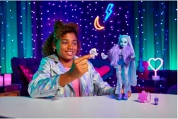 Lange pastelfarvede hår og glitrende striber giver dukken et iset, men fascinerende look.