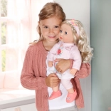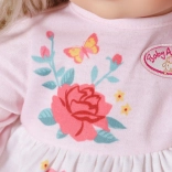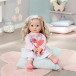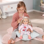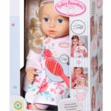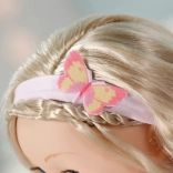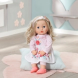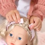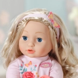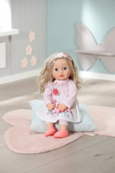 Dukken Sophia fra Baby Annabell-kollektionen har smukt blondt hår, som du konstant kan style. Hun bærer et moderigtigt lyserødt hårbånd med sommerfuglepynt, der passer perfekt til hendes lyserøde kjole med blomsterprint. Hun kan godt lide at have sit lange hår løst, hvilket giver dukken et naturligt udseende. Med sin realistiske ansigtstekstur og detaljerede tøj giver hun børn en fantastisk mulighed for fantasifuld leg.