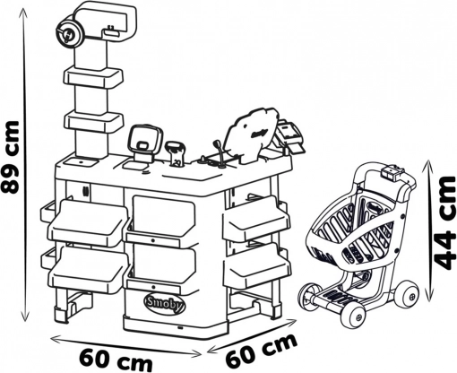 Supermarked med kasseapparat, frugt-/grøntafdeling og vægt (ny mekanisk vægt: den viste vægt justeres efter de vejede fødevarer). Barnet kan indstille uret og skiltet åben/lukket. Indeholder 42 tilbehør: pasta, småkager, morgenmadsprodukter, mælk, 6 stykker frugt og grønt, 1 kage, 2 makroner, 2 dåser, 1 elektronisk stregkodescanner med lyd og lys, 1 kreditkort, 4 kvitteringer, 9 mønter og 12 sedler. Kasseapparatet har pengekasse, mikrofon og kortlæser. Indkøbsvogn inkluderet.