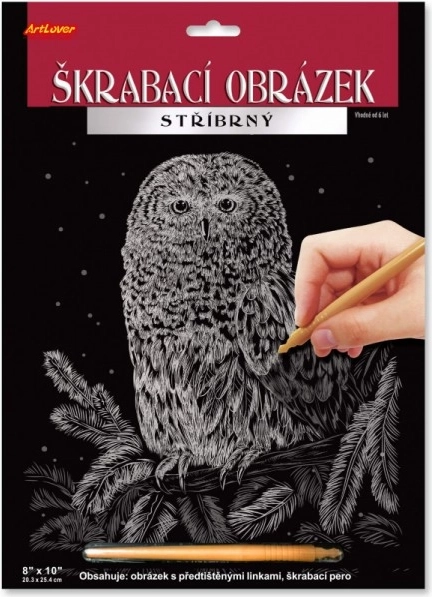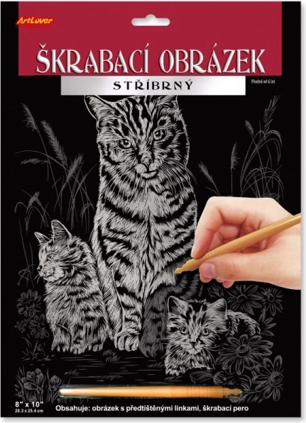 Opdag ARTLOVER skrabebillede med motiv af en kat med killinger, som ved afskraben afslører en sølveffekt. Format 20 × 25 cm, i pakken et plastik skrabepen (14 cm). Suveræn kreativ underholdning fra 6 år og træning af finmotorik.