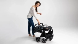 Med ét tryk klapper klapvognen automatisk sammen. De kompakte mål, specialovertræk og skulderrem gør transport og opbevaring let.