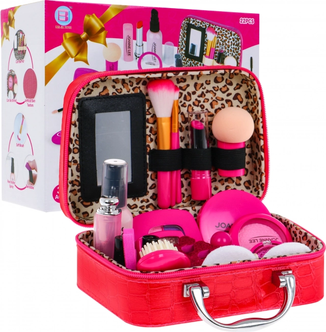 | Et sæt med en lille taske fyldt til randen med sikre makeup-tilbehør er legetøj til børn fra 3 år. Den elegante, store kuffert er lavet af blød økolæder. Den har et behageligt håndtag, fire små fødder på undersiden og et indvendigt spejl. Lukkes med lynlås. Hele sættet består af 22 dele,og indeholder kosmetik som øjenskygger, glitter, læbestifter, neglelak, mascara og meget mere. Kosmetikken er attrap, men ser realistisk ud, slides ikke, og barnets hud er i sikkerhed. Leg med kosmetik udvikler kreativ tænkning, træner fantasien og støtter koncentrationen. | |
