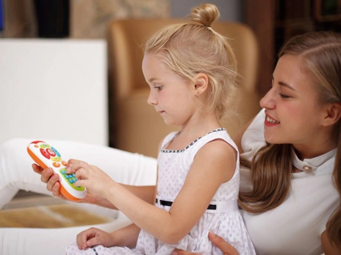 Barnet får sin egen “fjernbetjening” og kan trygt “skifte kanaler”. Den engelsktalende legeting hjælper med udtalen af de første ord.