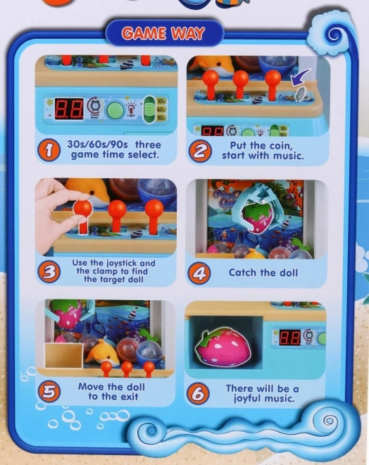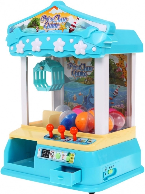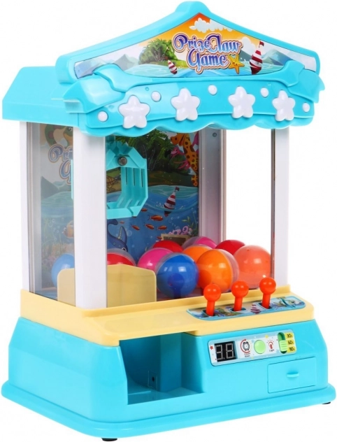 Alle kender de populære automater i butikscentre, hvor man kan fange en maskot. Vi præsenterer en mindre version, en lille automat, som giver masser af underholdning for alle. Spillet har lyd- og lyseffekter. Der er 3 sværhedsgrader at vælge imellem: 30 s, 60 s, 90 s. Spillet starter, når der indlægges en plastikmønt (12 stk. medfølger). Målet er at fange en bold (10 stk. medfølger) med kloen inde i automaten; afhængigt af sværhedsgraden har man 30 s, 60 s eller 90 s. Spillet starter, når der indlægges en plastikmønt (12 stk. medfølger). Under fangstforsøget ledsages man af livlig musik. Man kan lægge en overraskelse i bolden, hvilket gør spillet endnu sjovere. Ud over bolde kan man også lægge små legetøj, maskotter m.m. i maskinen. Spillet har to lydstyrkeniveauer og mulighed for at tænde og slukke lyseffekterne. Automaten kører på 3 x LR20-batterier (medfølger ikke) eller via USB-kabel (medfølger). Legetøjet er beregnet til børn fra 3 år og er CE-certificeret. | |