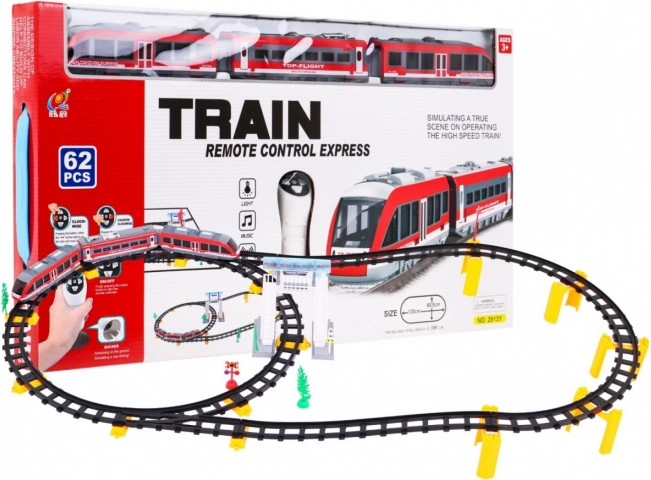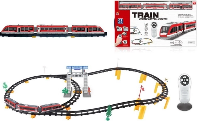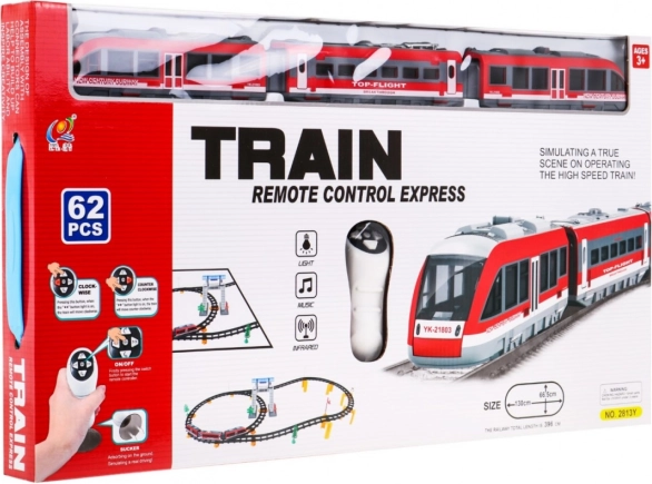| Det store togsæt med skinner er beregnet til børn fra 3 år. Sættet består af 62 dele, og banens længde er op til 396 cm. Toget styres med fjernbetjening og kører med eller mod urets retning. Toget afgiver kørselslyde, og for- eller baglygterne lyser afhængigt af kørselsretningen. Legetøjet drives af AA-batterier – 2 x 1,5 V (fjernbetjening) og 3 x 1,5 V (tog). | ||