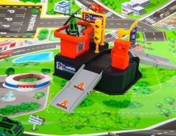 - Parkeringshus, legetøjsbil, helikopter, klistermærker, legemåtte med veje