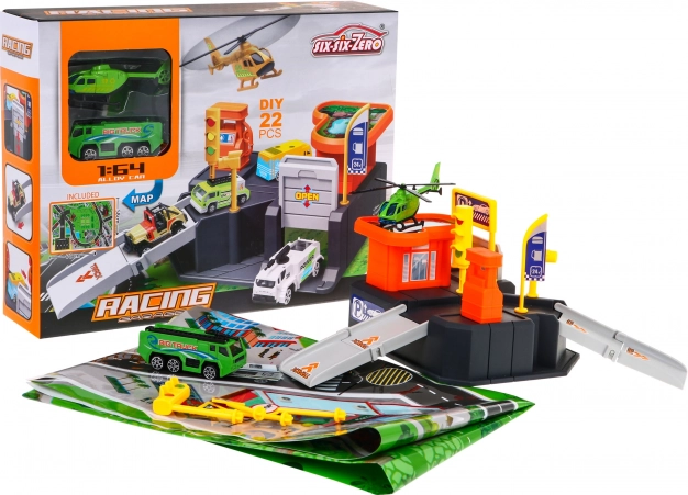 Inkluderer legetøjsbil, helikopter, skiltning og klistermærker. Sættet med 22 dele er klar til action lige efter udpakning.