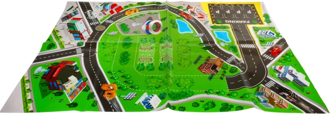 Måtten måler ca. 78 × 58 cm og viser gader, parkeringspladser og bygninger – ideel til at lære grundlæggende trafiksituationer.