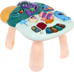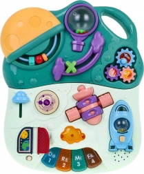 Bagbelyste tangenter, melodier, gear, skydere, kugler og en aftagelig raket fastholder opmærksomheden og udvikler finmotorik, syn og hørelse.