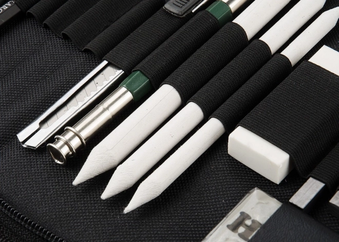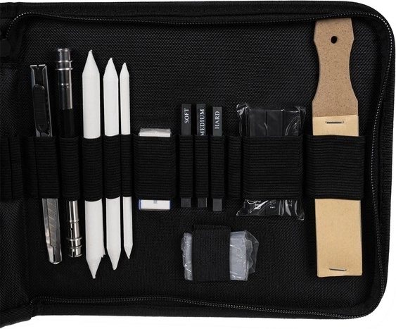 Der medfølger også blenders (papirtortillons) i tre diametre, en bogbinderkniv, dobbelt og klassisk blyantspidser, knædgummi (formbart viskelæder) samt et klassisk viskelæder og en sæt slibepapirer til perfekt formning af spidser. Sættet er fremragende til portræt, teknisk tegning og kunstneriske skitser.