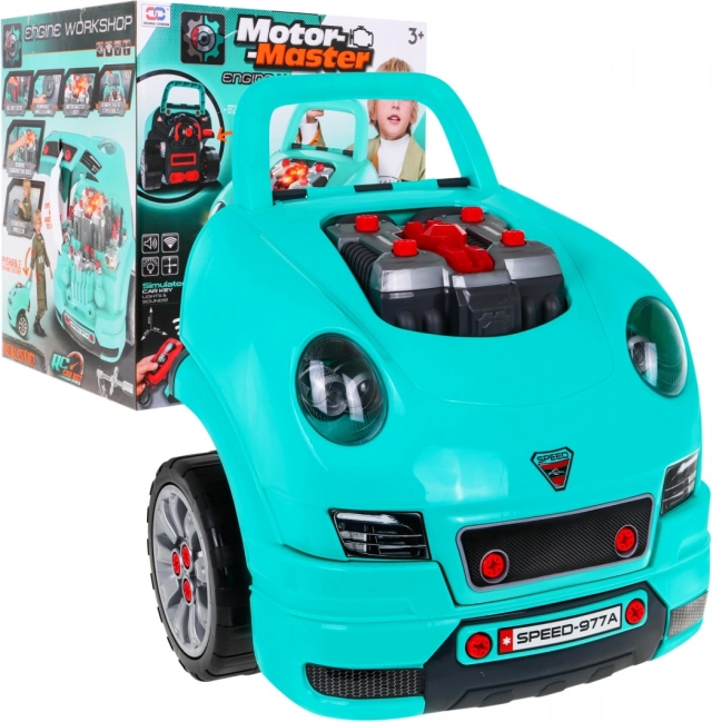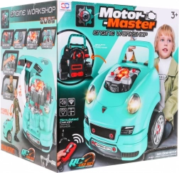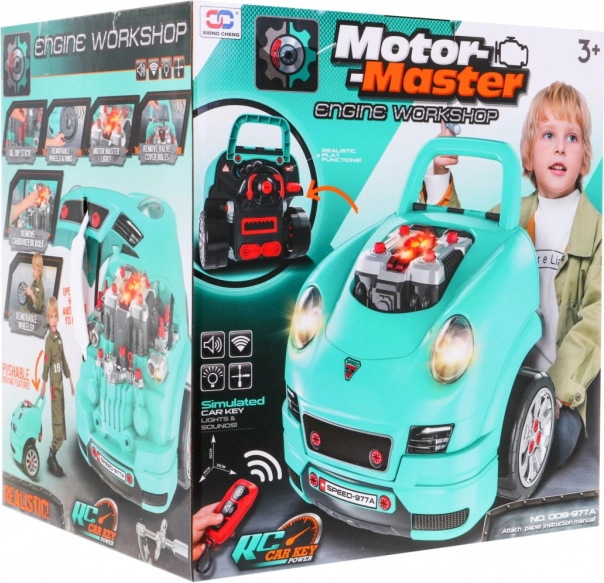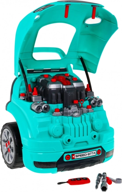 Dette omfattende sæt til den “lille mekaniker” indeholder fronten af en bil med en rigt udstyret motor til montering og demontering, et funktionelt instrumentbræt med startknap, rat med horn og advarselssignal. Børn kan “servicere” tændrør, hjul og motordele, mens lys og lyde styres med den medfølgende fjernbetjening.
