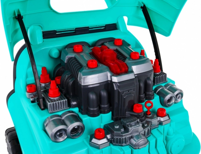 Under motorhjelmen venter masser af dele til montering og demontering: tændrør, propel, remme og dæksler. Børn kan prøve rigtige serviceprocedurer på en sikker og legende måde.