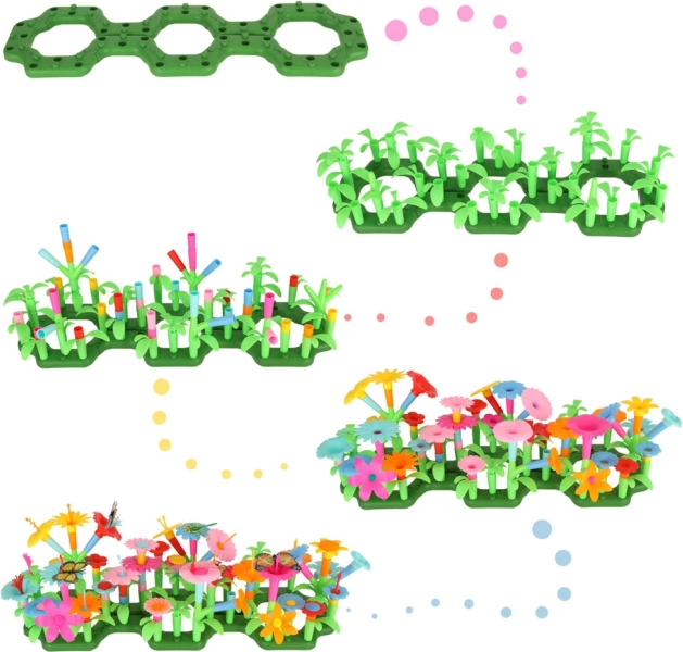 Dette kreative byggesæt giver børn mulighed for at bygge en have fyldt med farverige blomster, hvilket støtter deres kreative tænkning og manuelle færdigheder.