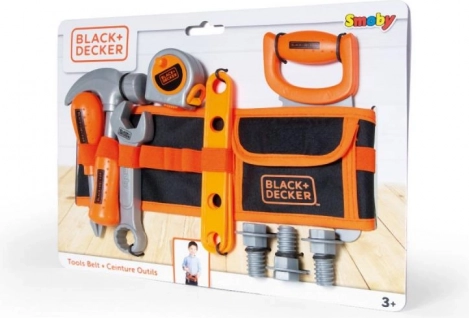 Værktøjsbælte med justerbar rem i Black & Decker-licens. Indeholder 14 stk. tilbehør: sav, skruetrækker, hammer, kombinationsnøgle, målebånd, 3 skruer, 3 flade beslag og 3 møtrikker. Med opbevaringslomme. Mål: 44 × 10 × 6 cm.