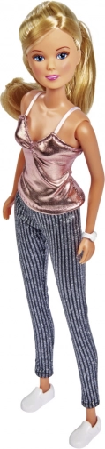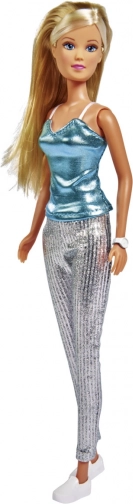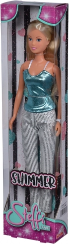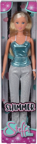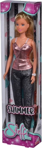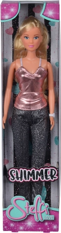 Oplev charmen ved dukken STEFFI LOVE Shimmer, der stråler i en trendy kombination – en glitrende top og skinnende bukser skaber det perfekte outfit til hverdagsleg og modeshows. Med tilbehør som hvide sneakers og et stilfuldt armbåndsur får dukken et sporty‑elegant look, der udvikler fantasien og sansen for detaljer.