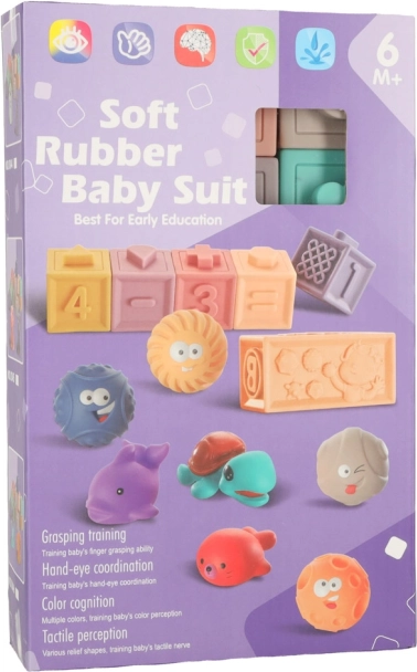 Dette sensoriske sæt kombinerer leg og læring i ét. De bløde silikoneklodser med tal og tegn motiverer børn til den første tællen, mens de varierede teksturer og relieffer udvikler berøring og koncentration. Bolde og klodser er ideelle til at bygge tårne, sortere og fri leg.