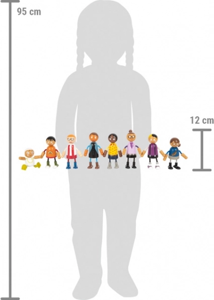 Opdag en farverig verden af historier med en fleksibel familie af trædukker. To sæt forældre, tre børn og en baby i bæresele, som kan fastgøres til andre figurer, giver utallige legescenarier. Takket være kombinationen af træ og tekstil er dukkerne robuste, detaljerede og behagelige at røre ved.