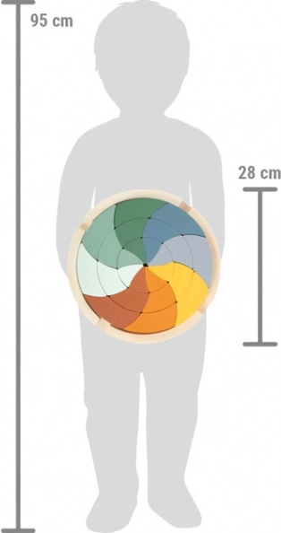 Dette designede træpuslespil i moderne farver bringer fri leg i Montessori-ånd. Børn øver sortering, samling, mønsterskabelse og logisk tænkning. Når det er samlet, opstår et imponerende mandalamotiv, som også kan fungere som dekoration på børneværelset.