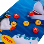Stor, tydeligt markeret måtte med start og nummererede felter for nem pointsummering. Havmotiv med pingviner og en haj understreger spillets atmosfære.