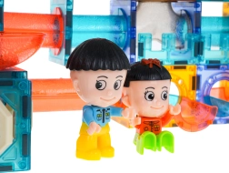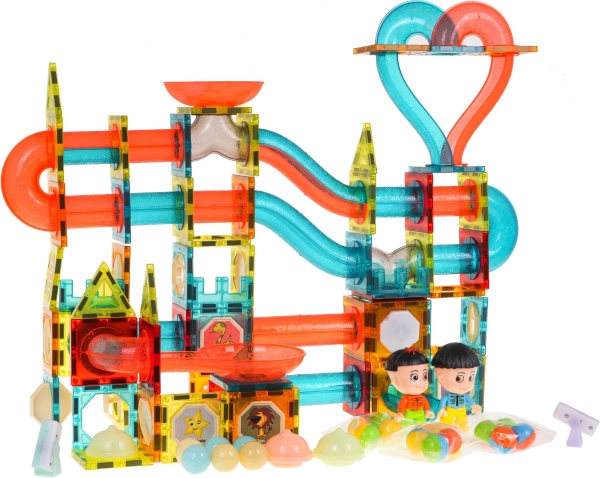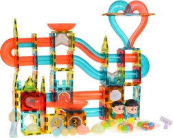 Magnetisk byggesæt til børn fra 3 år. Indeholder 202 dele og gør det muligt at bygge en kuglebane i valgfri opsætning. Nogle dele er batteridrevne; når de tændes, oplyser de banen med pulserende lys, og legen bliver endnu sjovere. Lysene blinker i 3 tilstande: hurtig, medium og langsom – du kan vælge den mest passende for barnet. Flere kugler blinker også, når de rystes. Sættet indeholder desuden farvede kapsler, der skifter farve, samt to LED-spotlights. Strømforsyning: 18 x 1,5V LR1130, 12 x 1,5V LR41, 8 x 3V CR1220 (batterier er inkluderet).
