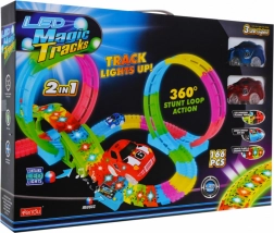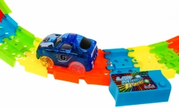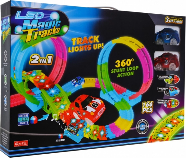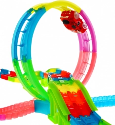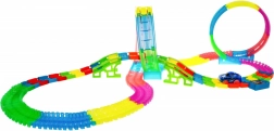 Dette store sæt indeholder 166 byggedele til en fleksibel bane, som nemt klikkes sammen i forskellige former, inklusive 360° loops og hældninger. De fluorescerende overflader lyser i mørke efter opladning med lys og skaber sammen med bilernes LED-effekter en fængende visuel oplevelse.