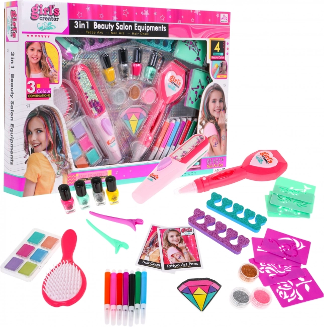 Smukt 3-i-1 sæt til piger er ideelt til kreativ styling af farvet hår, manicure og tatoveringer. Sættet kombinerer sikre og ikke‑toksiske kosmetiske redskaber, som nemt fjernes efter legen.