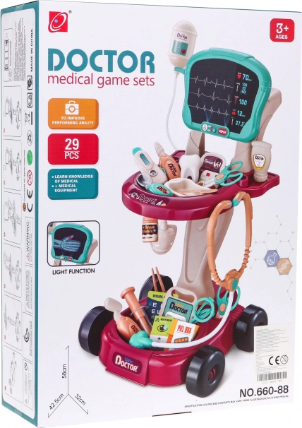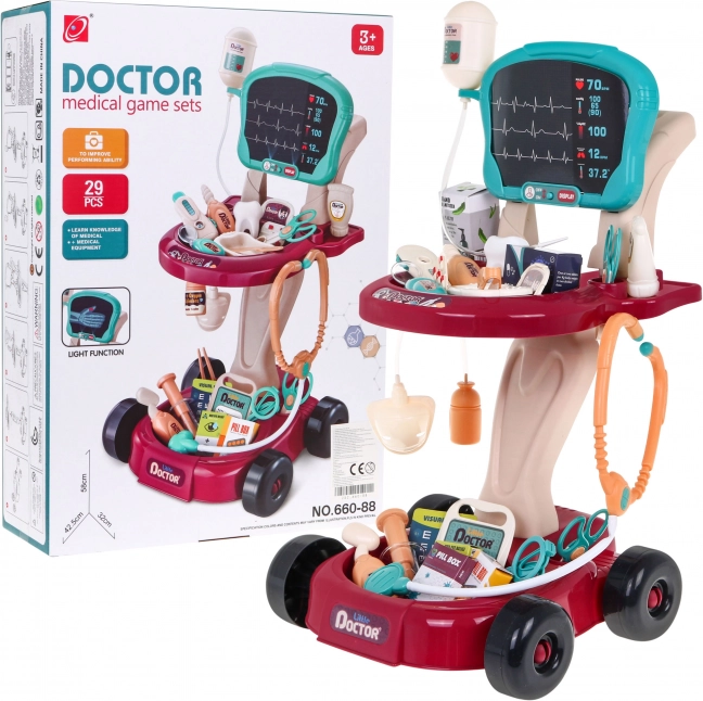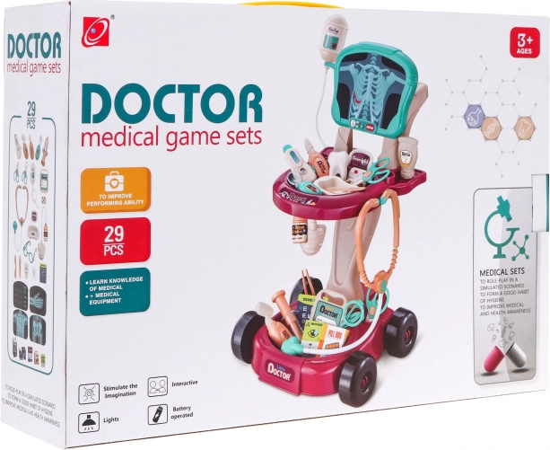 Dette sikre og farverige lægesæt er designet som en bekvem vogn på hjul, som nemt kan flyttes. Det giver børn alt, hvad de behøver for at lege læge og udvikle en sans for omsorg og empati.