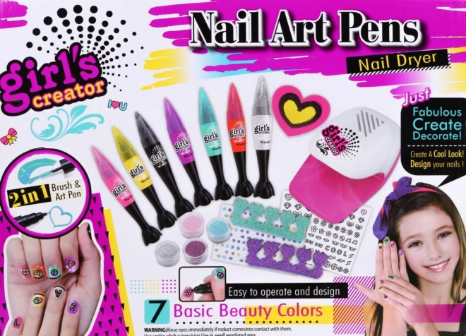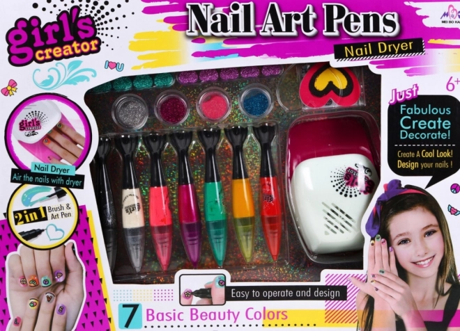 Sjovt negledekorationssæt til børn 6+ med batteridrevet neglertørrer og kreative penne.